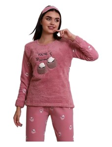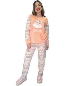 FashionWoman Γυναικείο σετ πιτζάμας fleece πορτοκαλί με ανάγλυφο σχέδιο – κέντημα σκούφο (DREAM).