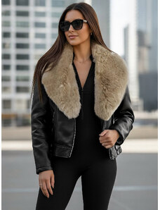 Γυναικείο δερμάτινο μπουφάν μαύρο-μπεζ OZONEE JS/61M8508/392BZ