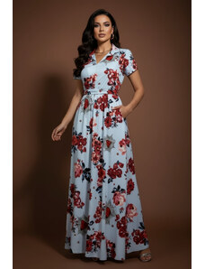 Parizianista φόρεμα maxi floral κοντομάνικο με ζώνη & τσέπες - Σιέλ - 079001