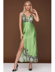 Parizianista σατινέ φόρεμα τιράντα με σκίσιμο & floral λεπτιμέρειες - Πράσινο - 039009