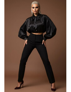 Parizianista πουκάμισο crop top balloon με κορδέλα & περλίτσες κουμπιά - Μαύρο - 002009