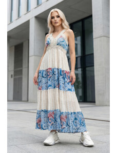 MAXI Φόρεμα Boho με Δέσιμο & Φουντάκια – Parizianista Exclusive - Μπλε - 025009