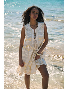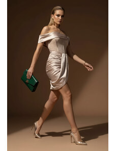 Parizianista mini σατέν φόρεμα ασύμετρο με στρασάκια στο ντεκολτέ - Μπεζ - 059014