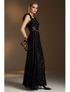 Parizianista φόρεμα με παγιέτες maxi με τούλι στο πλάι & πούπουλα στις τιράντες - Μαύρο - 002005
