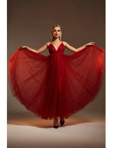 Parizianista φόρεμα τούλινο εξώπλατο με μπούστο κεντημένο με πούλιες & σκίσιμο μπροστά - Κόκκινο - 010014