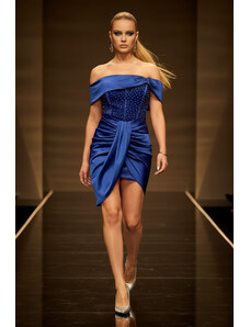 Parizianista mini σατέν φόρεμα ασύμετρο με στρασάκια στο ντεκολτέ - Μπλε - 025005