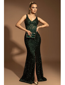 Parizianista maxi φόρεμα παγιέτα με δαντέλα κέντημα στη μέση - Πράσινο - 039014