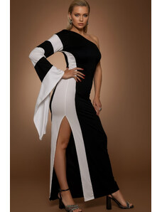 Parizianista maxi φόρεμα με έναν ώμο και σκίσιμο από τη μία πλευρά - Ασπρόμαυρο - 004004