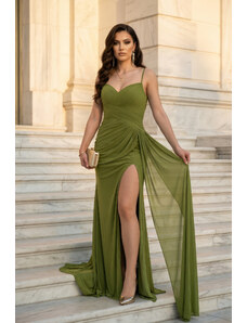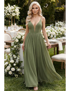Parizianista Γυναικείο Maxi Φόρεμα Σιφόν Με Τιράντες Και Βαθύ V Μπούστο - Χακί - 019014