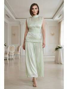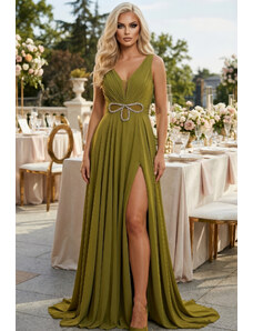 Parizianista Maxi Αέρινο Φόρεμα με Σχέδιο Στρας στη μέση & Σκίσιμο – Elegant Βραδινό Φόρεμα - Αβοκάντο - 089005