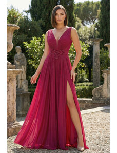 Parizianista Maxi Αέρινο Φόρεμα με Σχέδιο Στρας στη μέση & Σκίσιμο – Elegant Βραδινό Φόρεμα - Φούξια - 029005