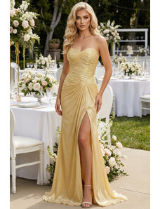 Parizianista Maxi Φόρεμα με Draped Σχέδιο, Σκίσιμο & Ανοιχτή Πλάτη – Elegant Φόρεμα - Κίτρινο - 008014