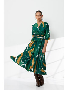 FIBES Γαλάζιο μίντι κρουαζέ εμπριμέ φόρεμα σατέν 05-9046-BLUEL, Χρώμα Γαλάζιο, Μέγεθος 60