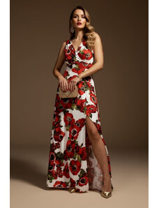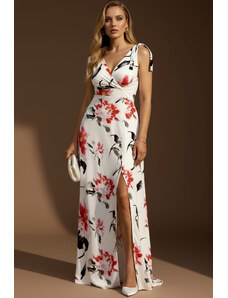 Parizianista Floral Maxi Φόρεμα με Φιογκάκια στους Ώμους & Σκίσιμο - Λευκό - 009001