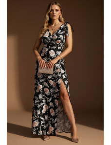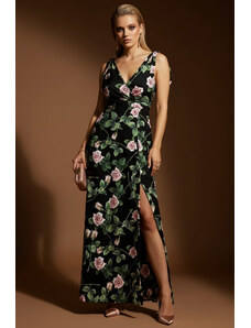 Parizianista Floral Maxi Φόρεμα με Φιογκάκια στους Ώμους & Σκίσιμο - Μαύρο - 002001